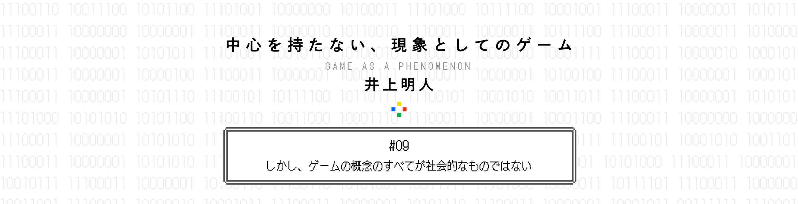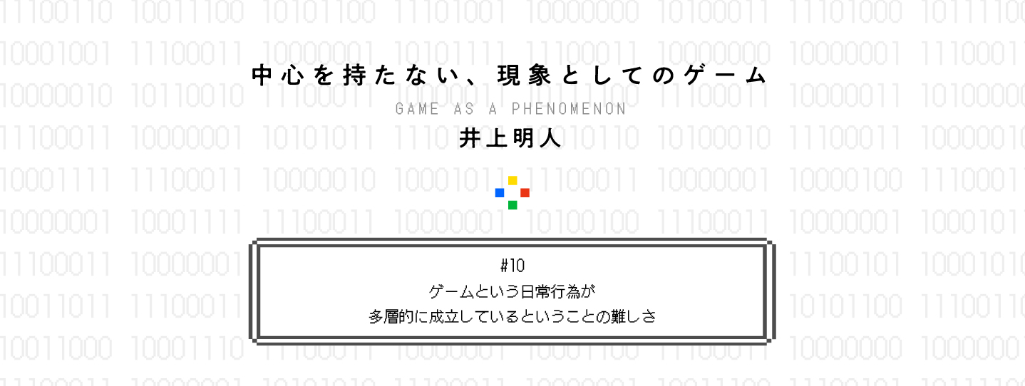 ゲーム研究者の井上明人さんによる連載「中心をもたない、現象としてのゲームについて」。「ゲームや遊びとは何か?」。この問いに答えるべく、ゲームや遊びに関わる多様な現象——ルール、コミュニケーション、非日常など——が興味深いかたちで相互に関係しあっている、その複雑さを論じます。今回は、多層的に成立する日常行為としてのゲームを「創発」を手がかりに分析します。