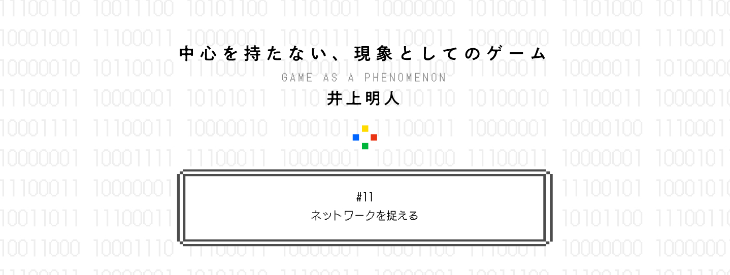 中心をもたない、現象としてのゲームについて――ネットワークを捉える|井上明人ゲーム研究者の井上明人さんによる連載「中心をもたない、現象としてのゲームについて」。「ゲームや遊びとは何か?」。この問いに答えるべく、ゲームや遊びに関わる多様な現象——ルール、コミュニケーション、非日常など——が興味深いかたちで相互に関係しあっている、その複雑さを論じます。今回は「多層性」を前提とするゲームの概念をネットワーク構造として分析します。 記事を読む