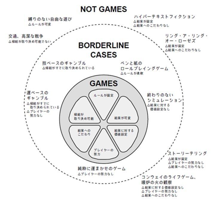 このモデルでは、ゲームの古典的なイメージを形づくる六つの要素が提示され、それによって「典型的なゲーム」を説明しようとしている。重要なのは、単に代表例を示すだけでなく、その六つの要素を使って「境界例」をも説明しようとしている点である。6つの要素のうち、いずれかが欠ければ即座にゲームではなくなるという考え方ではない。いくつかの要素が欠ければ典型的なゲームからは遠ざかってゆくが、すぐさまゲームではなくなるわけではなく、ゲームと言えるかどうかの境界的な事例として位置づけられるということになる。たとえば、くじ引きや、答えの決まっているパズルは、そうした境界的な事例だ。このモデルは、次のような図として示されている。