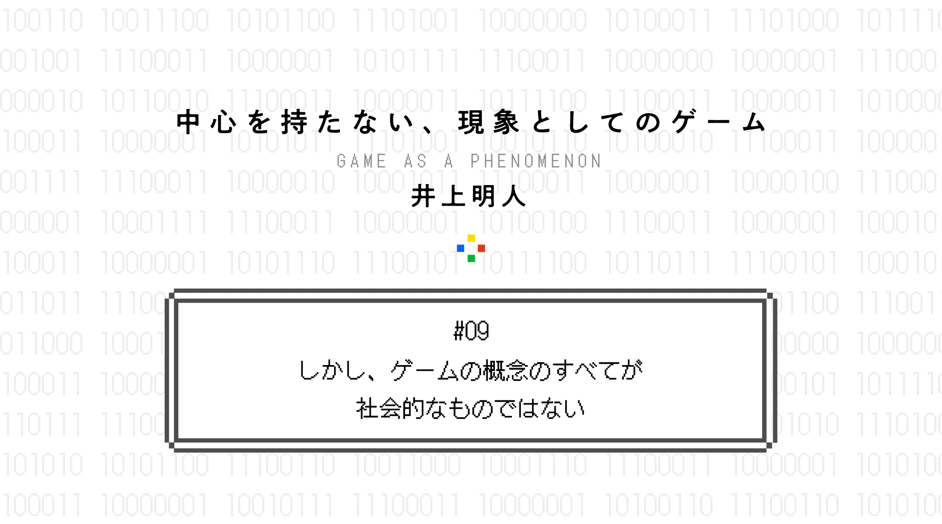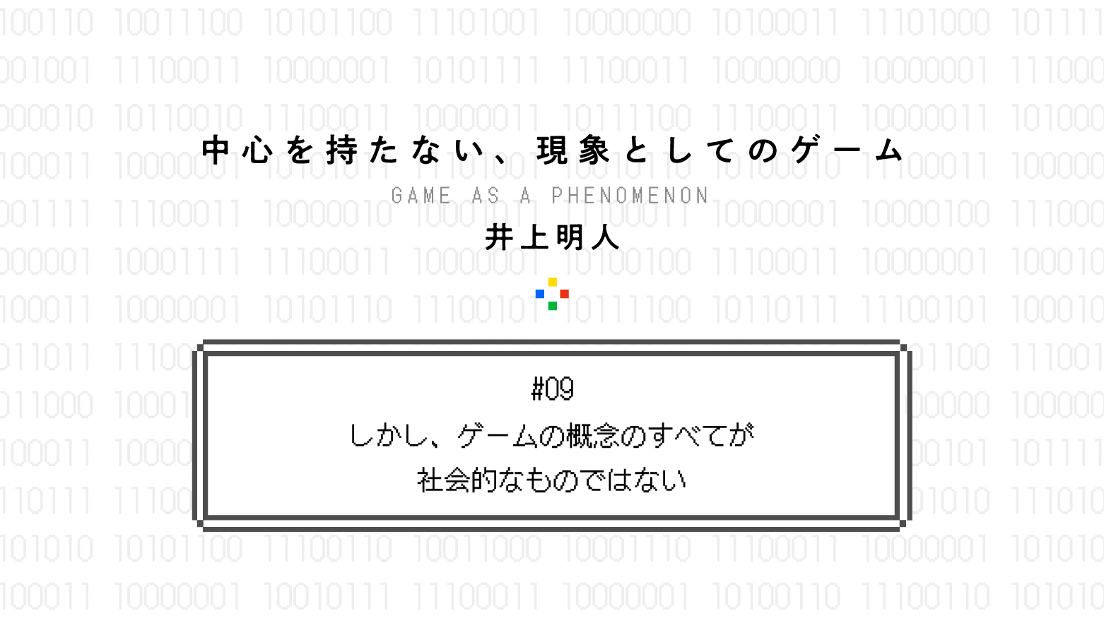 ゲーム研究者の井上明人さんによる連載「中心をもたない、現象としてのゲームについて」。「ゲームや遊びとは何か?」。この問いに答えるべく、ゲームや遊びに関わる多様な現象——ルール、コミュニケーション、非日常など——が興味深いかたちで相互に関係しあっている、その複雑さを論じます。
