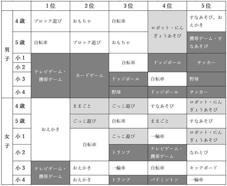 これが成長するにつれて、好まれる遊びの傾向に変化が生まれてくる。表1は、4歳から10歳にかけての子どもの好きな遊びが、どう変化していくかを調べたものだ。まず、ティッシュ箱をひっくり返すような遊びをしていた幼児は、少し育つと、ままごとや、人形遊びといった遊びをはじめる。これらは、行為の虚構性を理解しなければ、そもそも遊ぶことができないものだ(表の■薄い灰色部分)。さらに、5歳~7歳ぐらいの年齢の子どもになると、野球やサッカー、トランプやデジタルゲームなど、かなり複雑なルールをもち、組織化された遊び(表の■濃い灰色部分)を遊びはじめる。バットでボールを打つという行為は、それ自体では完結した遊びではなく、攻守・点数・ヒット・ホームランなど、その遊び全体を構成する一連の行為の一部として、理解される必要がある。