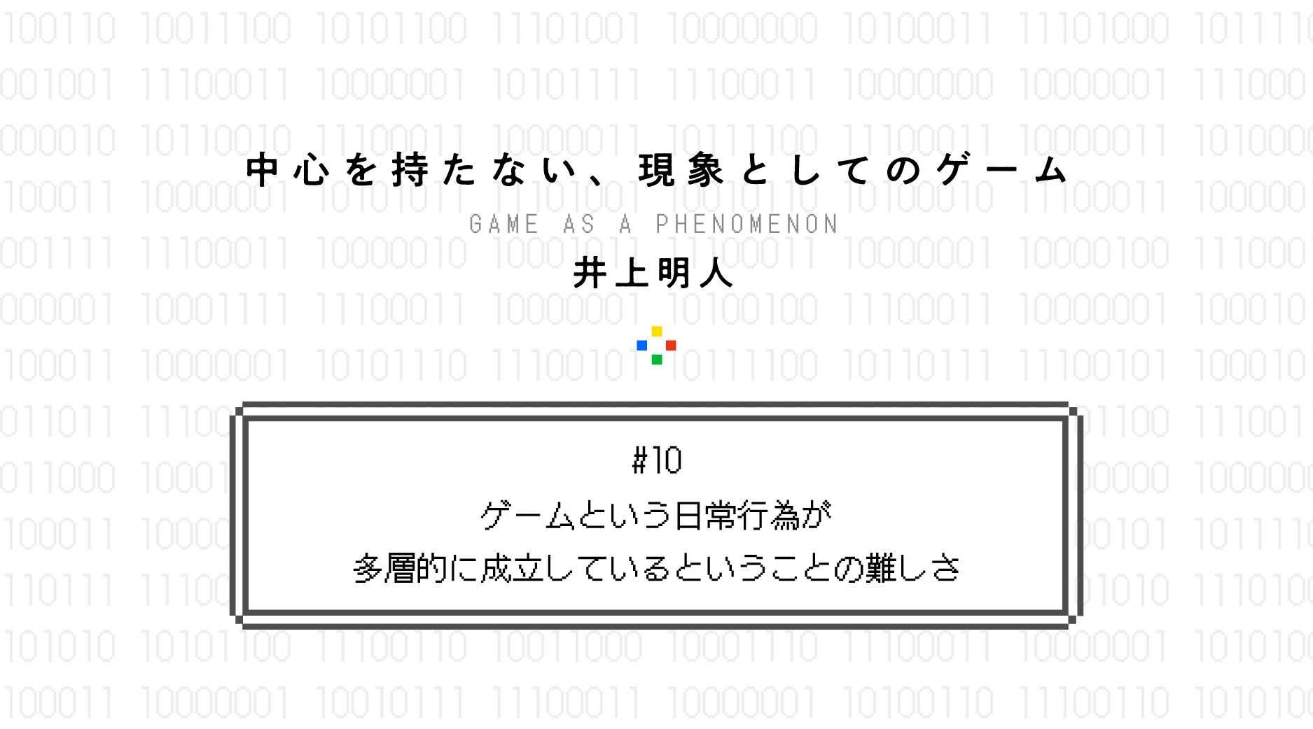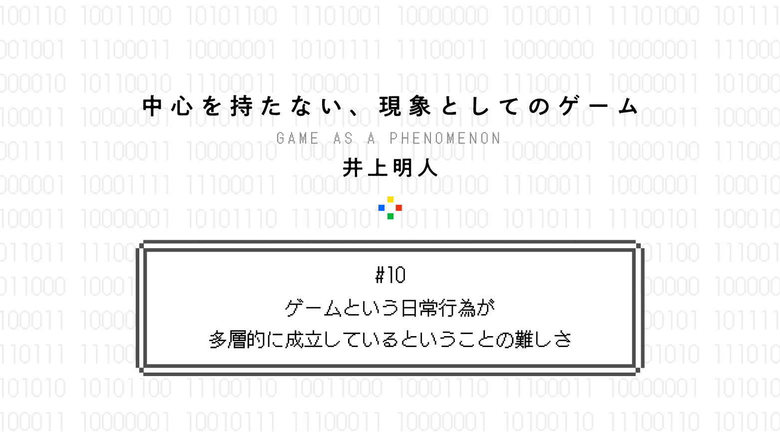 ゲーム研究者の井上明人さんによる連載「中心をもたない、現象としてのゲームについて」。「ゲームや遊びとは何か?」。この問いに答えるべく、ゲームや遊びに関わる多様な現象——ルール、コミュニケーション、非日常など——が興味深いかたちで相互に関係しあっている、その複雑さを論じます。