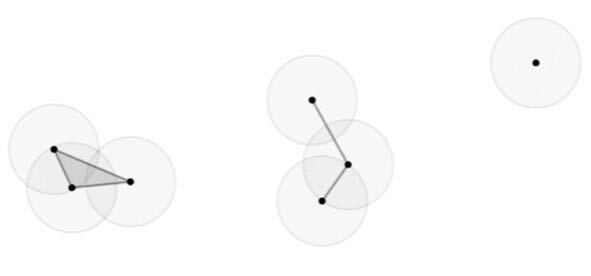 チェッホ複体では、各点の周囲に「探索可能な範囲」を表す円を仮定し、二つの円が重なっているとき、その二点の間に「関係が成立している」とみなして線を引く。こうして得られる点と線の集まりがネットワークを形作る。探索範囲の半径を連続的に変えることで、点どうしの結びつきが増減して、ネットワーク全体の形も変化していく。この「探索範囲を動かしながら、つながり方の変化を追う」という見取り図を概念化したものがチェッホ複体である[17]