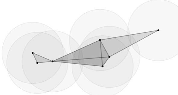 このように、点(例えば観測点・拠点・話者・文脈など)から到達できる距離=探索距離の広さによって、点どうしのつながりのネットワークが変化する。この発想を直観的に説明するモデルとして、トポロジーにおけるチェッホ複体(Čech complex)を参照しておこう。