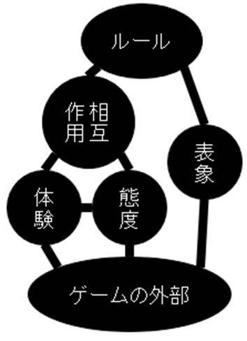 もちろん、もっと細かく分けることもできる。ルールの周辺概念をどこまで含むのか。同じ心理的なプロセスを経るものであるにせよ、体験と表象を分けるべきか。ゲーム内外の区別をどのような概念によってつけるのか。相互作用の概念化にも多様な仕方がある(これらの詳細な議論は第三部以後で行う)。ただ、大枠のまとまりがいくつかあり、それらが相互に関係しているという程度のことは言えるだろう。果たしてそれらが上下の関係で素描することが可能なものなのかどうかは、わからない。